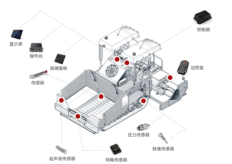 尊龙集团智能摊铺机解决方案整合了感知技术、自动控制系统和数据分析算法,实现了摊铺机高度智能化操作。通过实时获取路面信息和实时调整施工参数,使摊铺机操作更加精准、高效和可靠。