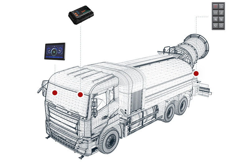 抑尘车电控系统采用新一代UI界面显示,集显控于一体,支持系统诊断与数据监控功能,可实现远程升级,大大增强了工作效率和用户交互体验。